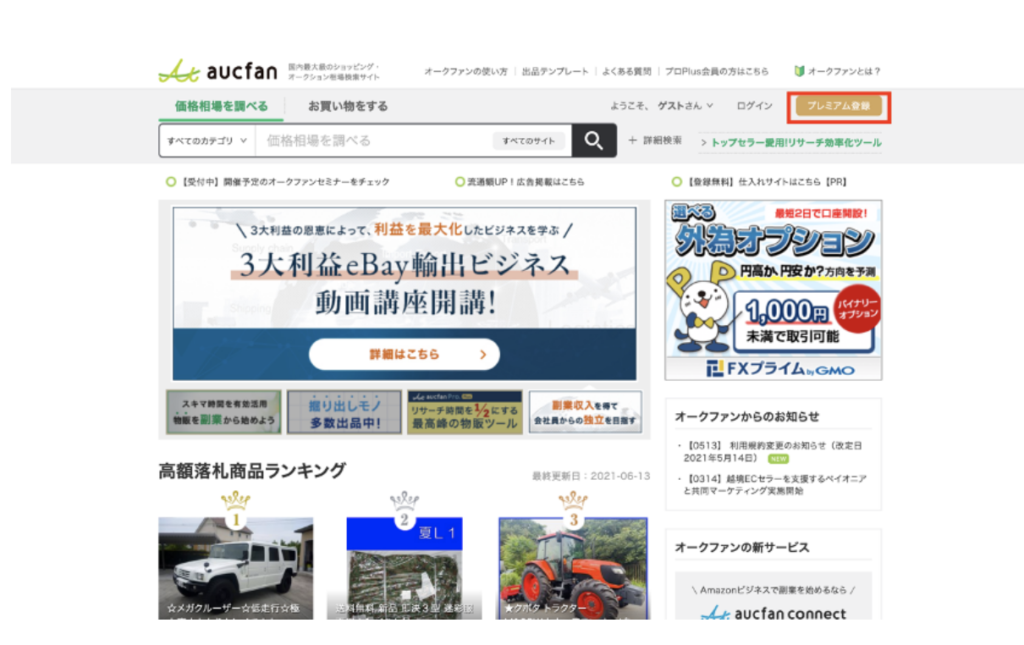 オークファン(https://aucfan.com/)にアクセスします。