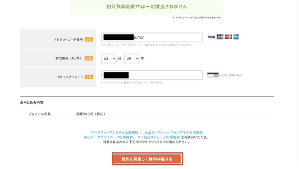 クレジットカードの情報を入力して、「規約に同意して無料体験する」をクリックします。