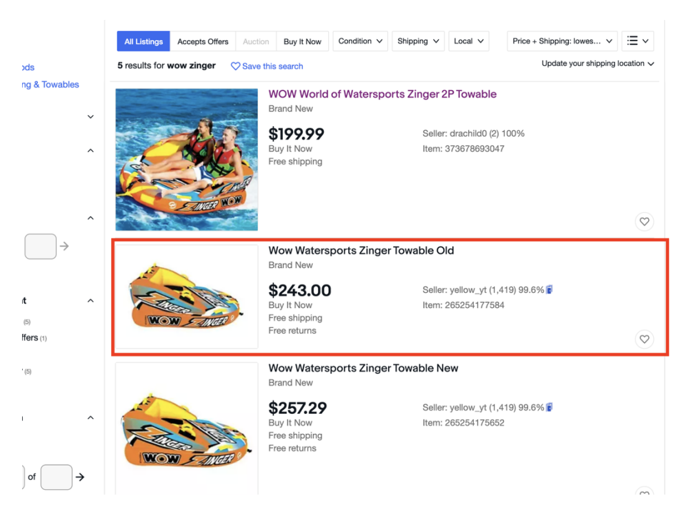 「Wow」と入力したところ、「wow zinger」の商品は2回販売されており、