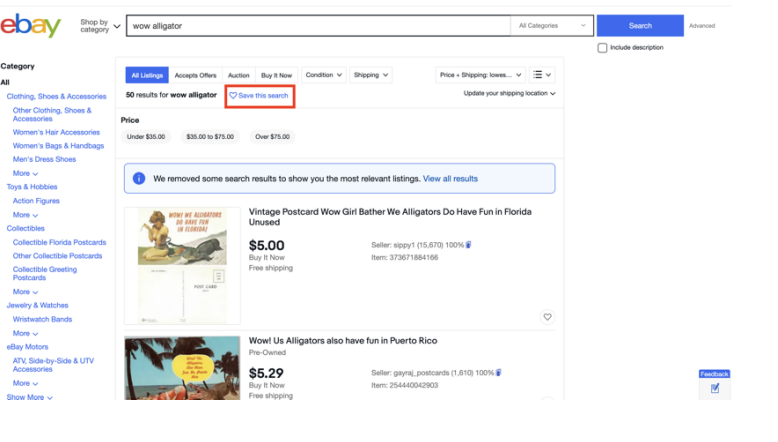 eBay上で「wow alligator」のキーワードを含む商品が出品されたら、